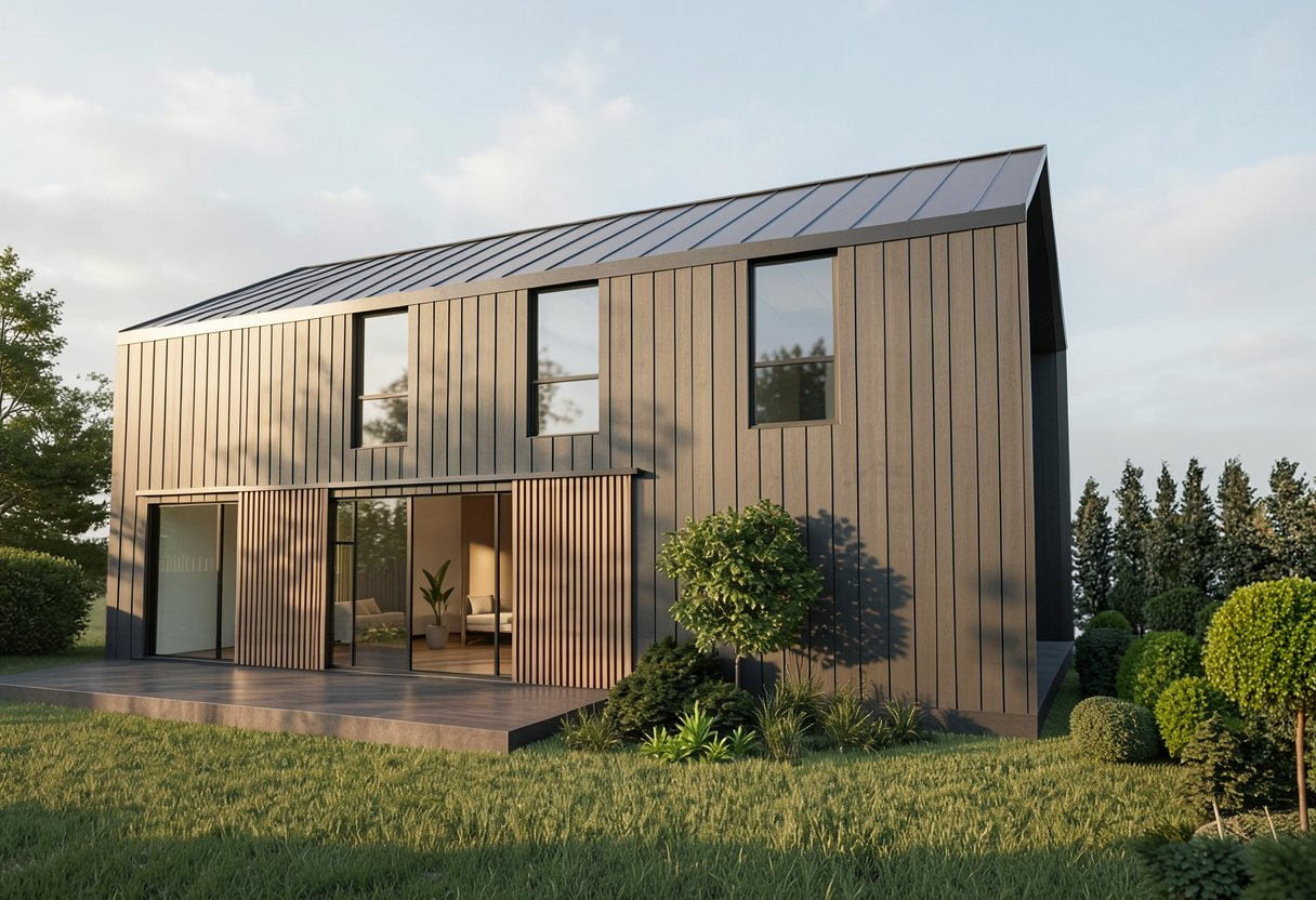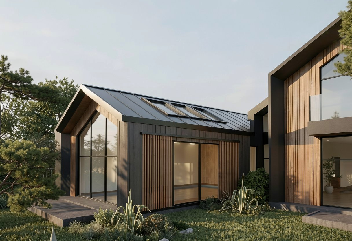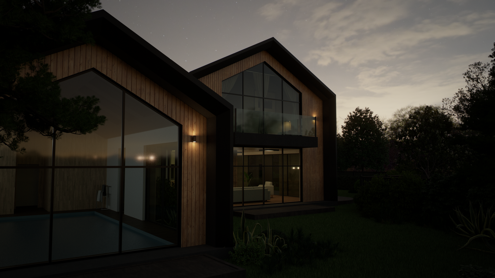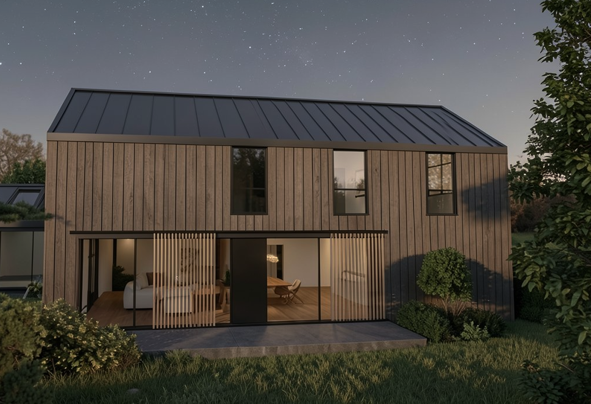The architecture adopts a simple yet striking form, combining pitched roof volumes with clean modern lines. Natural timber cladding and dark metal roofing were selected to complement the landscape, allowing the house to blend harmoniously into its setting while maintaining a refined architectural identity.