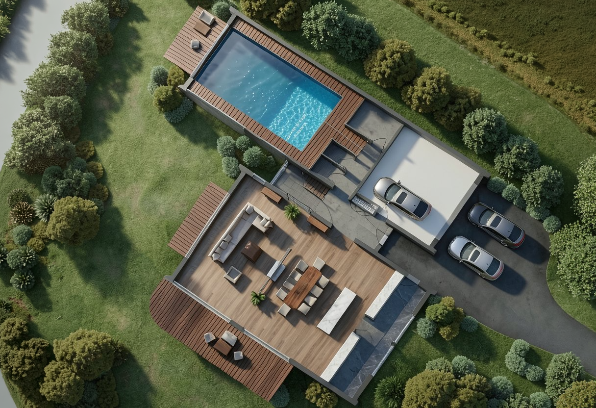 Outdoor living forms an important part of the design. A generous terrace and landscaped garden extend the living space outside, while a swimming pool and outdoor seating areas create a private environment for relaxation and family gatherings.