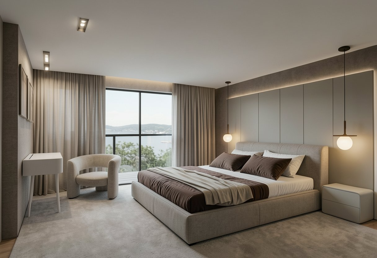 Bathrooms continue the theme of modern luxury, featuring stone-inspired surfaces, concealed lighting, and minimalist fixtures that enhance the sense of calm and refinement.