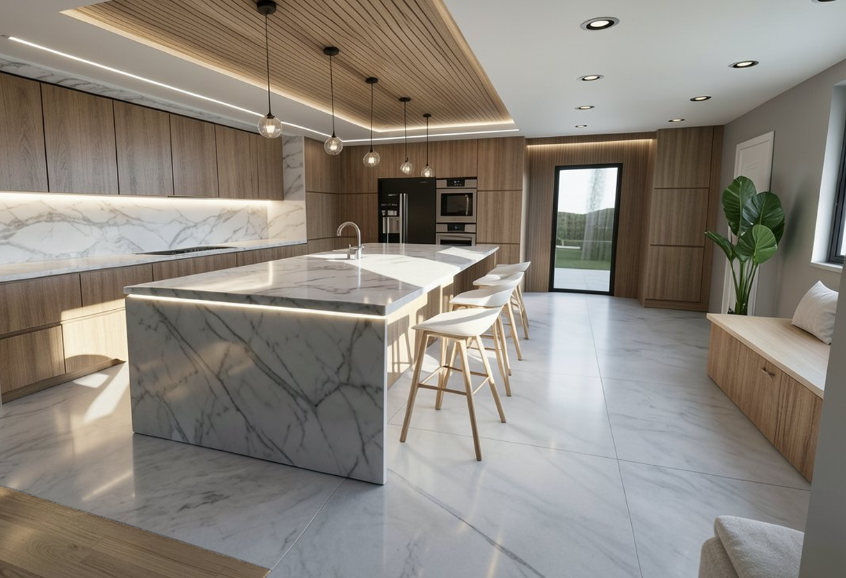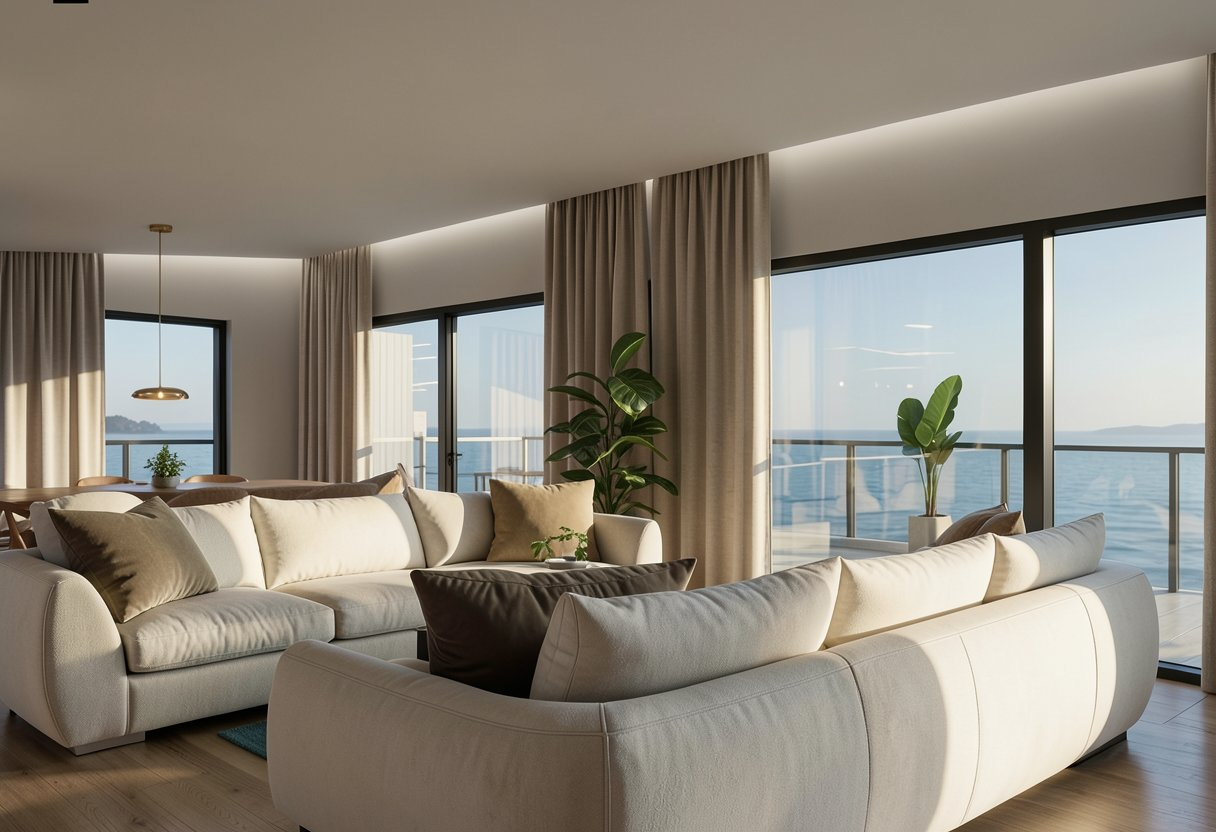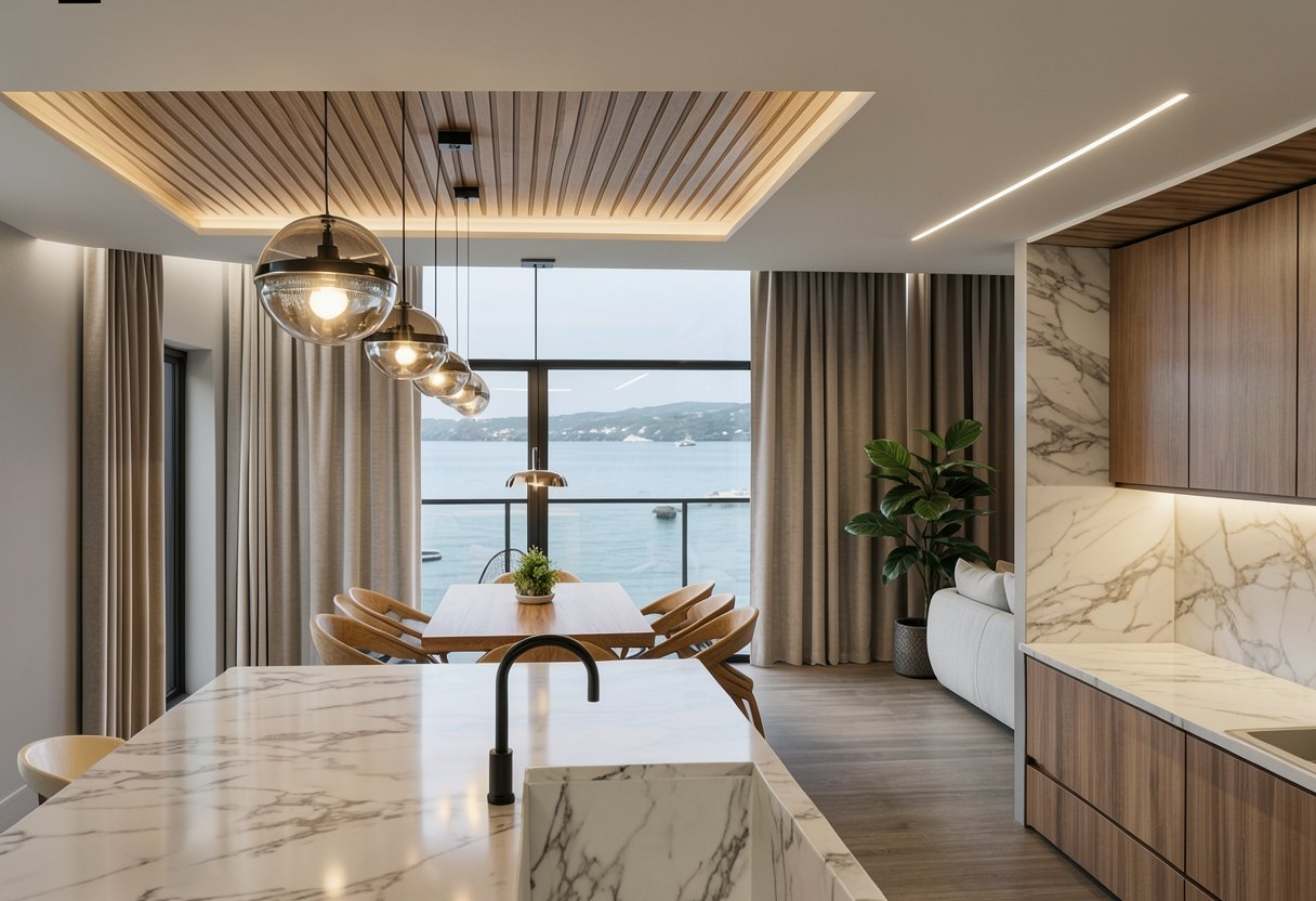 Inside, the design features a calming palette of natural wood, soft textures, and refined stone finishes. The open-plan kitchen and dining area form the heart of the home, defined by bespoke joinery, marble surfaces, and a warm lighting scheme that highlights the craftsmanship throughout. Large windows frame sea views and flood the interior with daylight, while contemporary lighting details add depth and character.